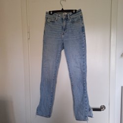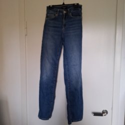 Snygga byxor från H&M i mörkblå färg. Men urtvättade. Jeansmodellen har en rak passform och normal midja. De har fem fickor, klassiska jeansdetaljer och en knappstängning med blixtlås. Perfekt för vardagsbruk.