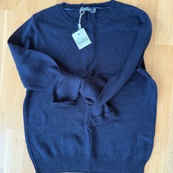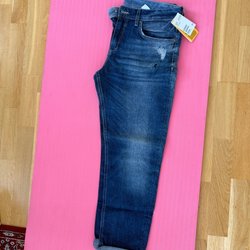 Nya silkeliknande Ett par mörkblå byxor med ett diskret mönster. Byxorna har resår i midjan och vid anklarna, vilket ger en bekväm och avslappnad passform.