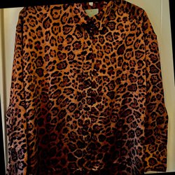 Ett par vida byxor med leopardmönster. Byxorna har resår i midjan och ett knytband.