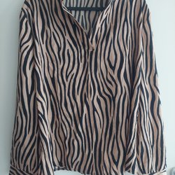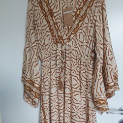 Bruna byxor med fickor med dragkedja på framsidan av benen. Byxorna har förstärkta partier på knäna och nedre delen av benen.