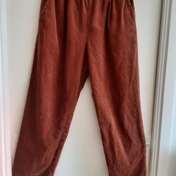Blå byxor med vida ben och resår i midjan. Tillverkade i europeiskt linnetyg i fin kraftig kvalitet. Byxorna har fickor fram och bak. Midjan går att sträcka till 48 x 2cm, övriga mått bild 5-7. Aldrig använda men tvättade en gång för att krympa dom.