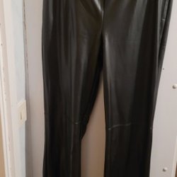 Dessa svarta byxor har en blank yta och en rynkad design längs benen. De är åtsittande och har en hög midja. Den blanka ytan ger en lackkänsla.