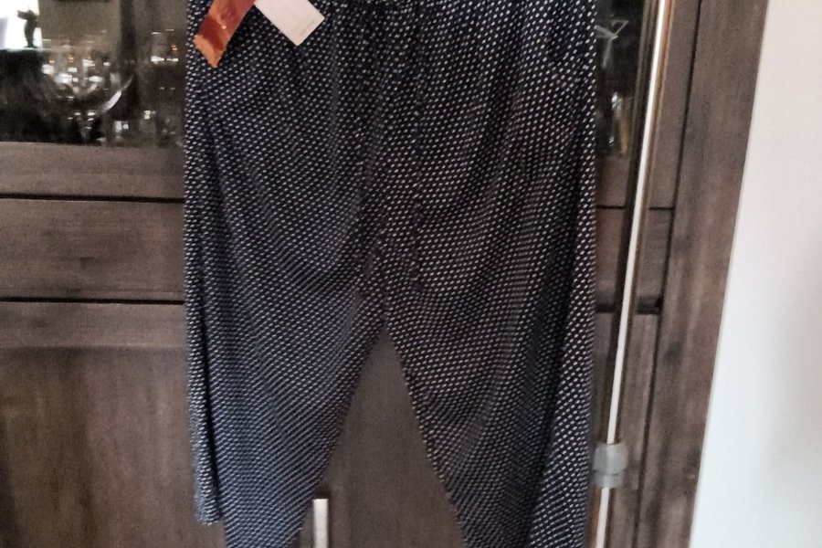 Blå byxor med vita prickar. Byxorna har en avslappnad passform och resår i midjan för extra komfort. Perfekta för både vardag och mer uppklädda tillfällen.