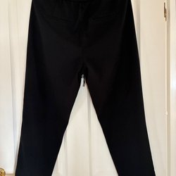 Svarta, stickade byxor med resår i midjan och en dekorativ vit rand nedtill. Byxorna har en bekväm passform och en stilren design. Använda vid ett fåtal tillfällen. Varma och sköna till vinter. Storlek Large