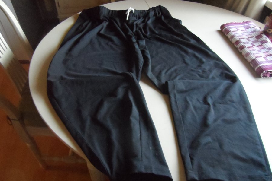 Svarta byxor med resår och dragsko i midjan. Byxorna har en lös passform och raka ben.storlek 4xl motsvarar ca 52-54. polyester elasta. som nya. fraktkostnad enl. postens tabell, 2 kr tillkommer i förpackningsmaterial. sändes inom sverige LYCKA TILL