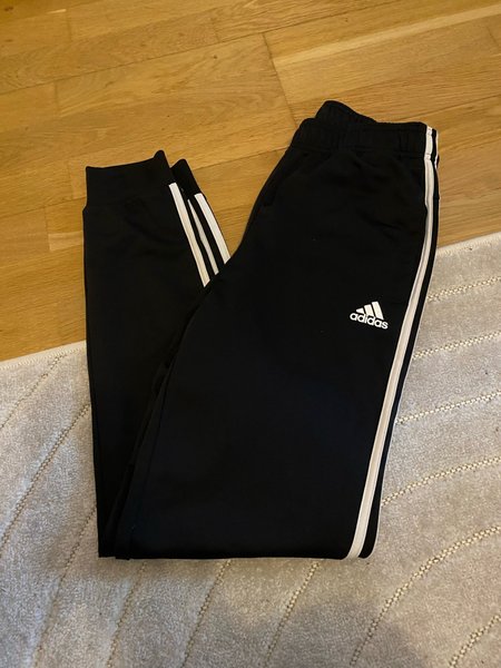 Svarta träningsbyxor från Adidas med vita ränder längs sidorna och Adidas-logotypen på vänster ben. Byxorna har muddar vid bensluten och en resår i midjan.