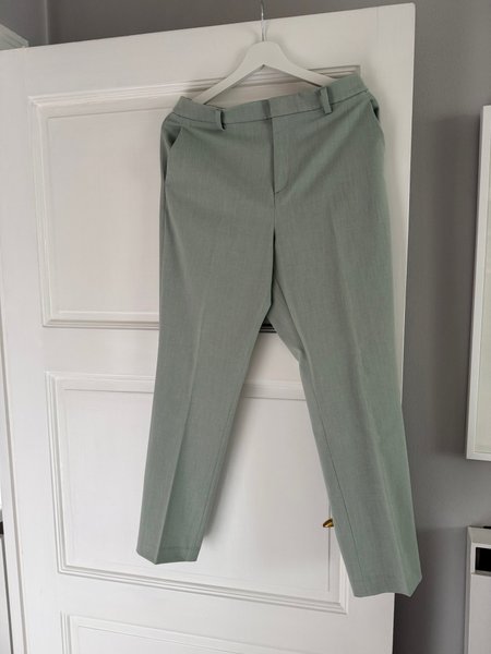 Byxor i en ljusgrön nyans med pressveck framtill. Byxorna har en medelhög midja med hällor för skärp och fickor i sidorna. Passar bra för både vardag och mer uppklädda tillfällen.