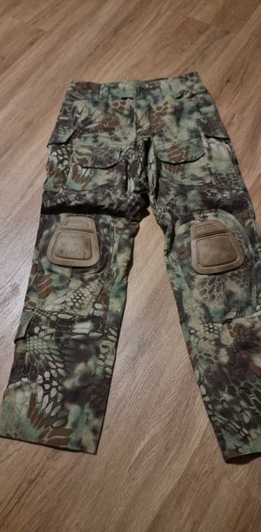 Byxor med kamouflagemönster och förstärkta knäpartier. Byxorna har flera fickor, inklusive sidfickor och benfickor med lock. Midjan är utformad för en bekväm passform.