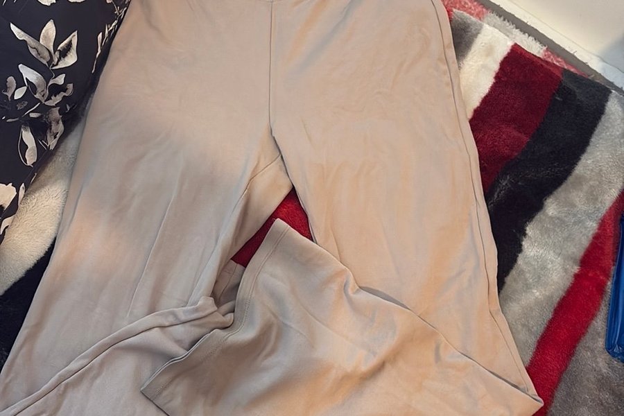 Ett par beiga byxor med vida ben. Byxorna har en resår i midjan för en bekväm passform.