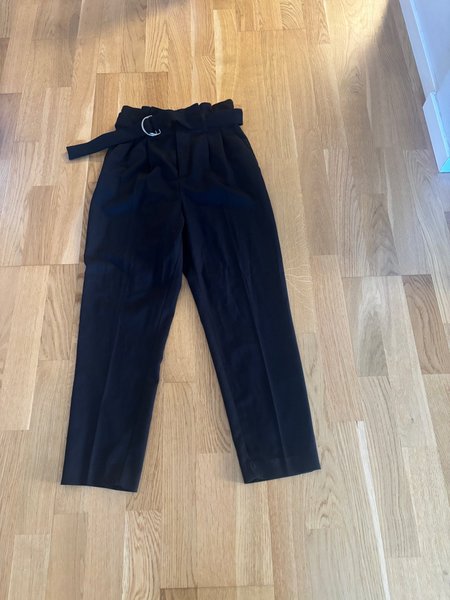 Svarta byxor med hög midja och ett bälte med silverfärgat spänne. Byxorna har en avslappnad passform och är lämpliga för både vardag och mer formella tillfällen.