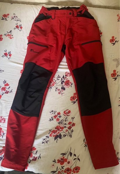 Röda friluftsbyxor ca 105 cm långt (Pinewood) med svarta förstärkningar på knän och bakdel. Byxorna har flera fickor, inklusive två handfickor med dragkedja och en benficka med dragkedja på vänster sida. Midjan är justerbar med bälteshällor.