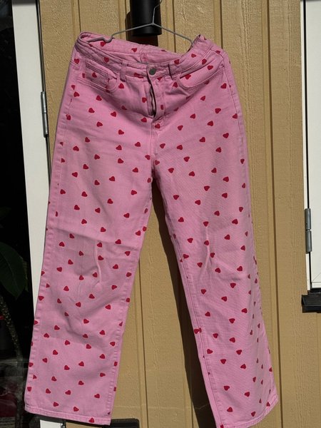 Ett par byxor i en ljusrosa nyans med ett charmigt mönster av små röda hjärtan över hela tyget. Byxorna har en klassisk jeansmodell med raka ben och en normalhög midja. De är försedda med fickor fram och bak samt en dragkedja och knappstängning i midjan. Byxorna har en avslappnad passform och kan stylas på många olika sätt.