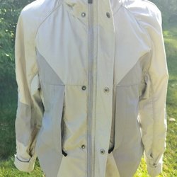 En vit jacka med fyra fickor framtill, två på bröstet och två nedtill. Jackan har knappar fram och en krage med dragkedja samt luva. På vänster ärm finns en logotyp.