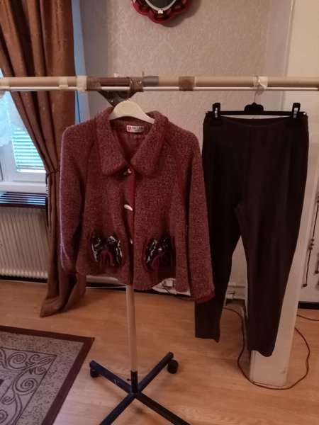 1st jacka bukle material med fina knappar och 2 fickor fram stl 38 +1par legings bruna, fina kläder.