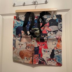 Svart axelremsväska med ett färgglatt blommönster på framsidan. Väskan har en axelrem i svart och en kedja. Den har ett lock med magnetlås och ett innerfack, samt ett fack på framsidan