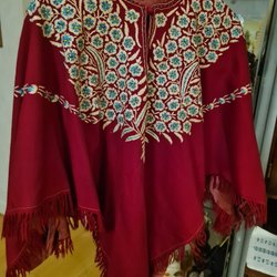 Vinröd poncho med volangdetaljer runt halsen, framsidan och nederkanten. Använd någon gång.