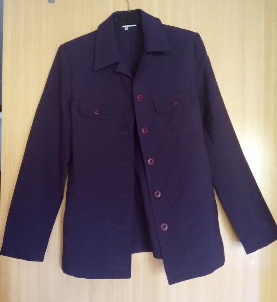 Jacka i en mörklila nyans med långa ärmar. Jackan har en traditionell krage och knäpps med matchande knappar. Två bröstfickor med knapp.