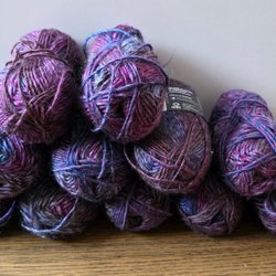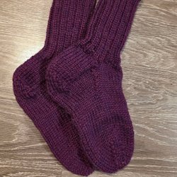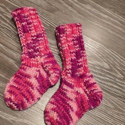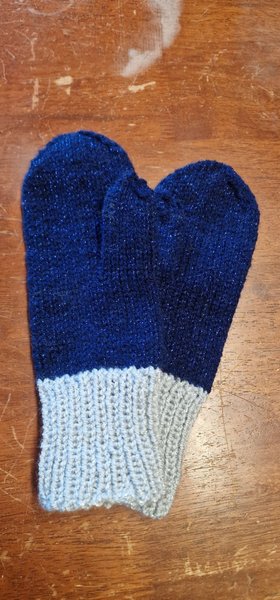 Ett par stickade vantar i två färger. Vantarna är stickade i en mörkblå färg med glittertrådar och har en grå mudd. Storlek small. Nya.