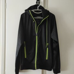 Svart långärmad tröja med dragkedja och hög krage. Tröjan har en liten logotyp på axeln.