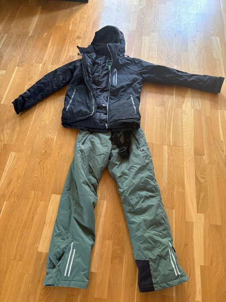 Ett set med en svart jacka och ett par gröna byxor. Jackan har en huva och dragkedja fram. Byxorna har hängslen och detaljer vid bensluten.