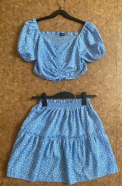 Ett blått set med ett mönster. Setet inkluderar en topp och en kjol.