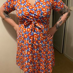 Blommigt mönster i rött, gult och grått på en ljus botten. Kaftanen har vida ärmar och en dekorativ bård längs kanterna och ärmsluten.