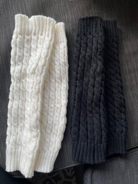 Ett par benvärmare i vitt och ett par i svart. Båda paren har ett flätat mönster.