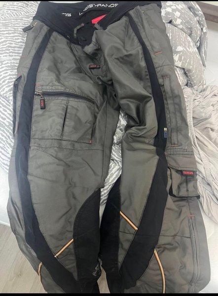 Byxorna har flera fickor, inklusive en med dragkedja på vänster ben och en mindre ficka på höger ben. Det finns svarta förstärkningar längs sidorna och på knäområdet, samt ljusare detaljer som löper längs benen. Midjan är justerbar med kardborreband och har en knapp- och dragkedjestängning. lindstrands mc byxor herr storlek M