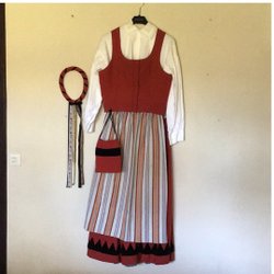 Traditionell folkdräkt i tre delar. Setet inkluderar en vit långärmad skjorta, en röd väst med dubbla knappar, en svart jacka med dekorativa knappar samt en hatt. Byxorna är i mollskinn och når till knäna, även de med knappar upptill och längs sidorna. Midjemått på byxan är 100cm och västens bröstvidd 110 cm. Nya skor storlek 10.
