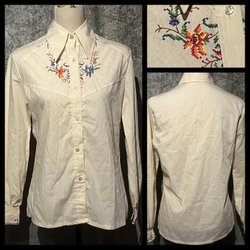 Snygg Vinson skjorta 70-tal. VDNmärkt. Bomullpolyesterblandning. Knäppning fram. Storleksmärkt 37/38. Bra skick. Minimala noppor vid armhål.