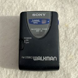 MP3-spelare från takeMS. Enheten är blå och silverfärgad med en liten skärm på framsidan. Kontrollknappar finns på ovansidan. Batterifack för ett AAA-batteri finns på baksidan.