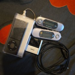 En samling MP3-spelare i olika modeller och färger. Inkluderar en kassettadapter MP3-spelare, flera fyrkantiga MP3-spelare i olika färger som guld, vit och silver, samt tillhörande hörlurar och USB-kablar.