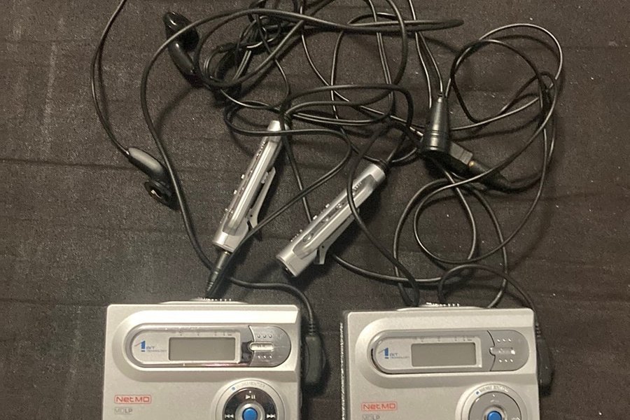 Två Sharp NetMD bärbara Minidisc-spelare. Båda har sladdar och en har hörlurar. Även en extra sladd av samma typ som de andra.