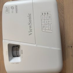 Säljer en projektor med tillhörande fjärrkontroll och strömkabel.