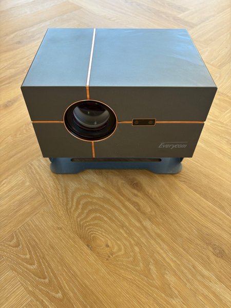 Everycom projektor i et kompakt design. Projektoren har et moderne udseende med en mørkegrå finish og kobberfarvede detaljer. Den er velegnet til hjemmebrug eller præsentationer.