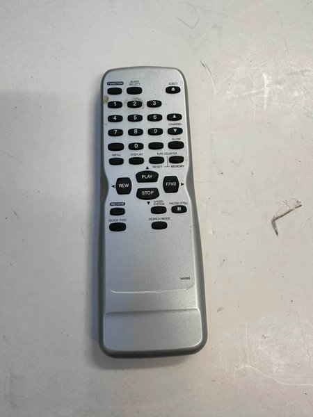 Fjärrkontroll med modellnummer NA988. Den har knappar för funktion, ljudval, utmatning, siffror 0-9, kanal, långsam, meny, display, räkneverk, återställning, minne, spela upp, spola tillbaka, snabbspolning framåt, stopp, rec/otr, hastighet/system, paus/still, snabbsökning och sökläge.