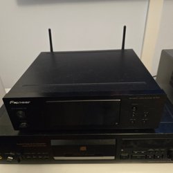 Ett par högtalare i vitt utförande. Varje högtalare har en diskant och två baselement. Anslutning sker via guldpläterade terminaler.