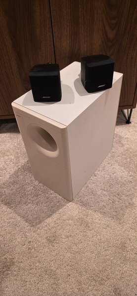 Bose Acoustimass högtalarsystem med en subwoofer och två satellithögtalare. Systemet är designat för att leverera klart ljud och djup bas. Subwoofern är vit och satellithögtalarna är svarta.