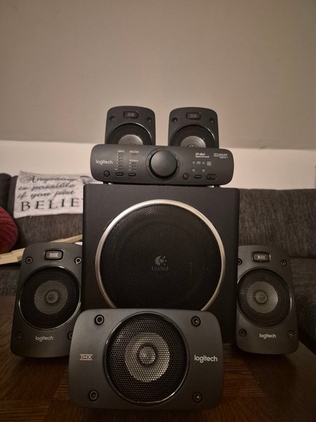 Logitech högtalarsystem med THX-certifiering. Inkluderar subwoofer och flera satellithögtalare för surroundljud. DTS Digital Surround och Dolby Digital.