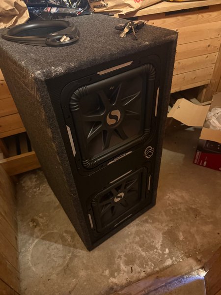 Kicker baslåda med dubbla element. Kicker är ett märke som är känt för att producera högkvalitativa billjudsprodukter. Denna baslåda är designad för att ge en kraftfull basupplevelse i bilen.