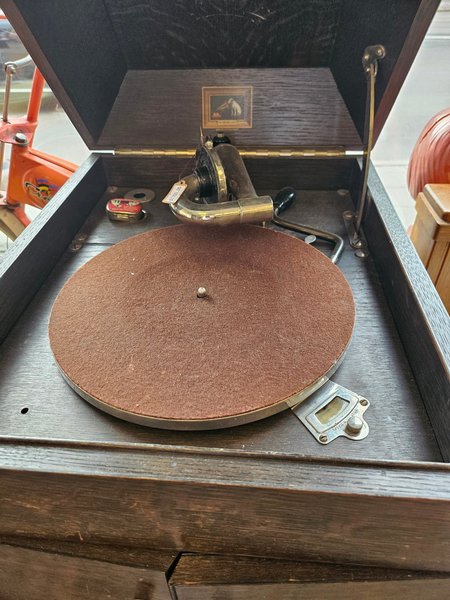 Grammofon i träkabinett med mässingsdetaljer. Skivtallriken är klädd med brun filt. Inuti locket finns en bild av en hund som lyssnar på en grammofon, med texten "His Master's Voice" under bilden. En hastighetsregulator finns vid sidan av skivtallriken.