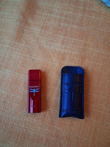 AudioQuest DragonFly Red USB DAC. Enheten är röd och har texten "DRAGONFLY" samt en trollsländesymbol. En svart förvaringspåse med texten "DRAGONFLY" och "audioquest" medföljer.
