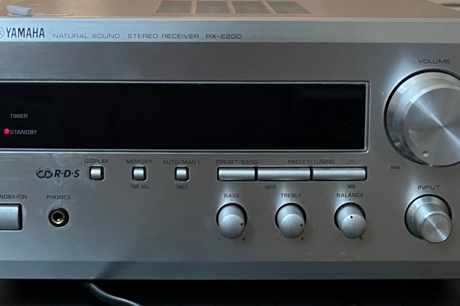 Yamaha Natural Sound Stereo Receiver RX-E200. Den har funktioner som timer, RDS, display, minne, auto/manuell, förinställning/band, förinställning/tuning, bas, diskant och balans.