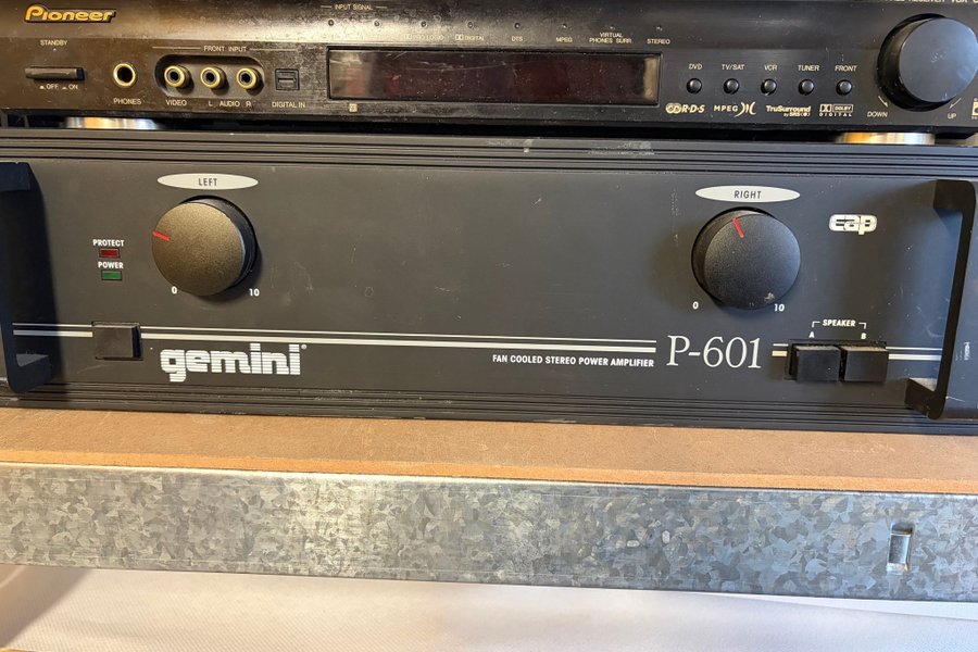 Gemini P-601 är en fläktkyld stereoslutsteg med individuella volymkontroller för vänster och höger kanal.