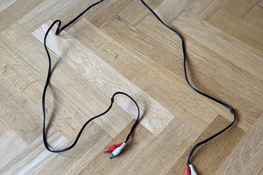 Svart RCA-kabel med röda och vita kontakter i båda ändar. Kabeln är lämplig för ljudanslutningar mellan olika enheter.