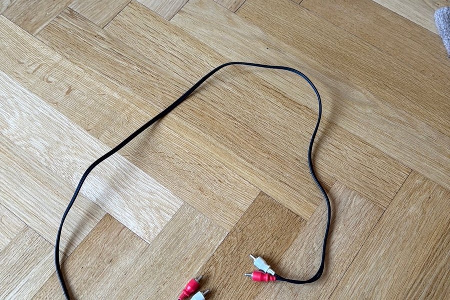 RCA-kabel med röd och vit kontakt i båda ändar. Lämplig för ljudanslutningar.
