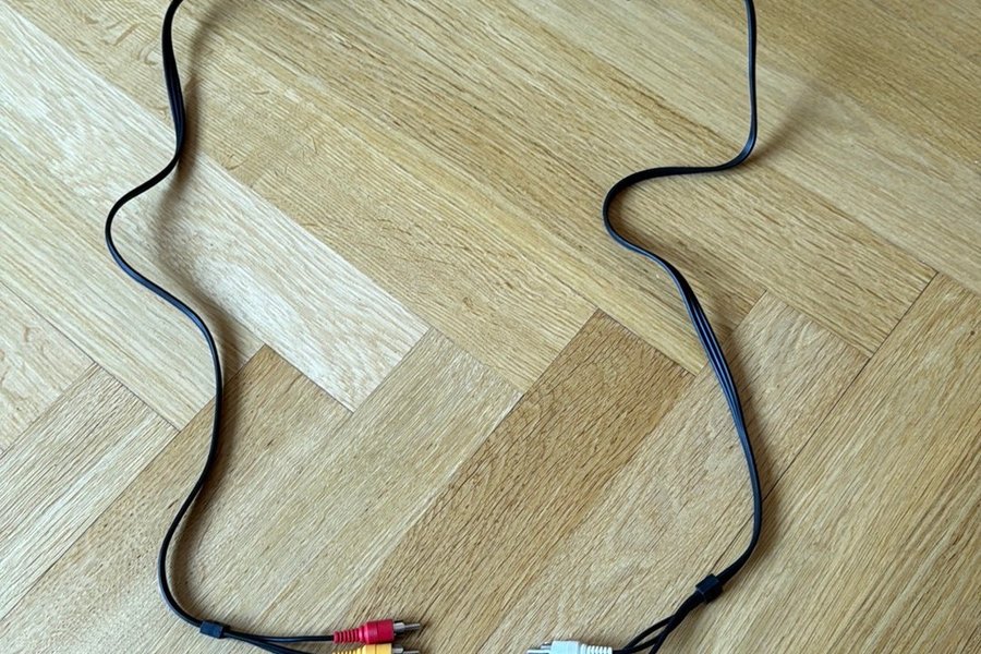 RCA-kabel med tre kontakter i varje ände, färgkodade i rött, vitt och gult. Kabeln är svart.