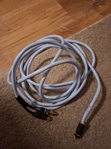 Ljudkabel med RCA-kontakter i båda ändar. Kabeln är vit och har svarta och guldfärgade kontakter.