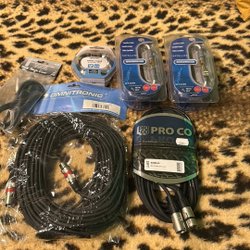 Ett sortiment av olika kablar. Inkluderar strömkablar, VGA-kabel, SCART-kabel, RCA-kabel och HDMI-kabel.