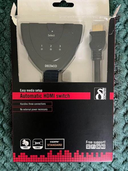 Automatisk HDMI-switch från DELTACO. Hanterar tre anslutningar. Ingen extern strömförsörjning nödvändig. 0.5m kabel.